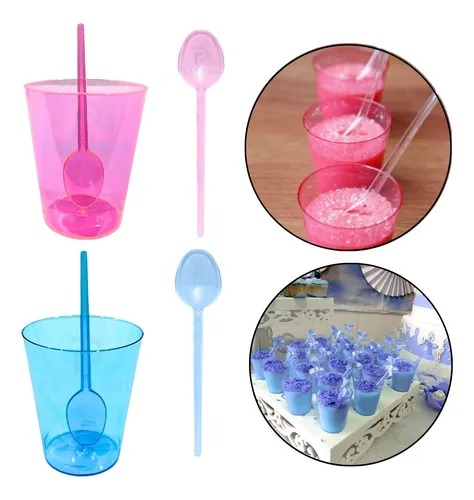 Contém 100 unidades copos, 100 unidades colheres