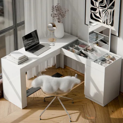Escrivaninha Penteadeira De Canto 3003023, ideal para quem busca modernidade e sofisticação ao ambiente. Estrutura em MDP de 15mm, pintura com revestimento Mob Print (Fosco). Composta por uma porta com dobradiças metálicas, prateleira interna, painel fixo com espelho quadrado, vidros deslizantes, nicho divisor organizacional para objetos e maquiagens, e acompanham sapatas plásticas. Perfeita para organizar suas maquiagens ou outros produtos proporcionando praticidade e conforto. Este móvel chegará na sua casa separado em 01 volume.