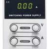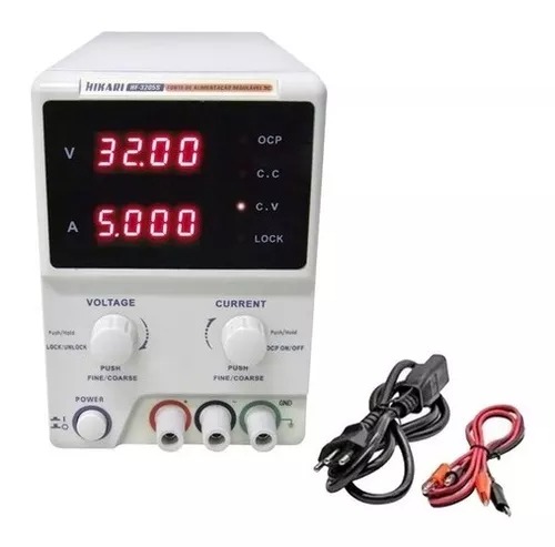 Equipamento digital de bancada, com dois displays de 4 dígitos (tensão e corrente), capaz de fornecer uma saída variável com tensão de 0 a 32V DC e corrente de 0 a 5A DC. Possui ajuste de tensão e corrente ajustado por potenciômetro, além de proteção contra sobrecarga, curto circuito, super aquecimento e inversão de polaridade.