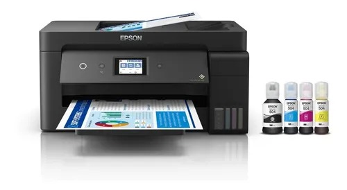 Impressora Multifuncional Wireless EcoTank L14150 da Epson é uma solução 4 em 1 que imprime, copia, digitaliza e possui função Fax. Projetada para imprimir sem cartuchos, é compatível com formatos até A3+. As garrafas de tinta são codificadas para facilitar o abastecimento dos tanques.