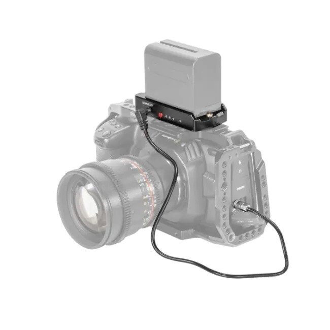 Placa adaptadora de bateria SmallRig NP-F com cabos de carregamento para câmeras BMPCC 4K e 6K EB2698 possui duas saídas DC 7,4 V e 12 V para alimentar sua câmera, estendendo muito o tempo de gravação. Ele vem com um cabo de carregamento de bateria LP-E6 e um cabo de carregamento DC-2 Pin conectado às câmeras BMPCC 4K ou 6K. A placa da bateria é construída com alumínio durável e possui uma almofada de borracha macia na parte inferior para fins de anti-torção. Você pode montar a placa no equipamento da câmera usando um parafuso de orelha de 1/4″ ou dois parafusos sextavados de 1/4″. Na lateral da placa estão o indicador de conexão da bateria (Azul) e o indicador de duração da bateria de três níveis (Amarelo) para verificar o status da carga. Os indicadores de vida da bateria apagarão após três segundos e a última lâmpada começará a piscar em 10% para alertá-lo sobre uma bateria fraca.